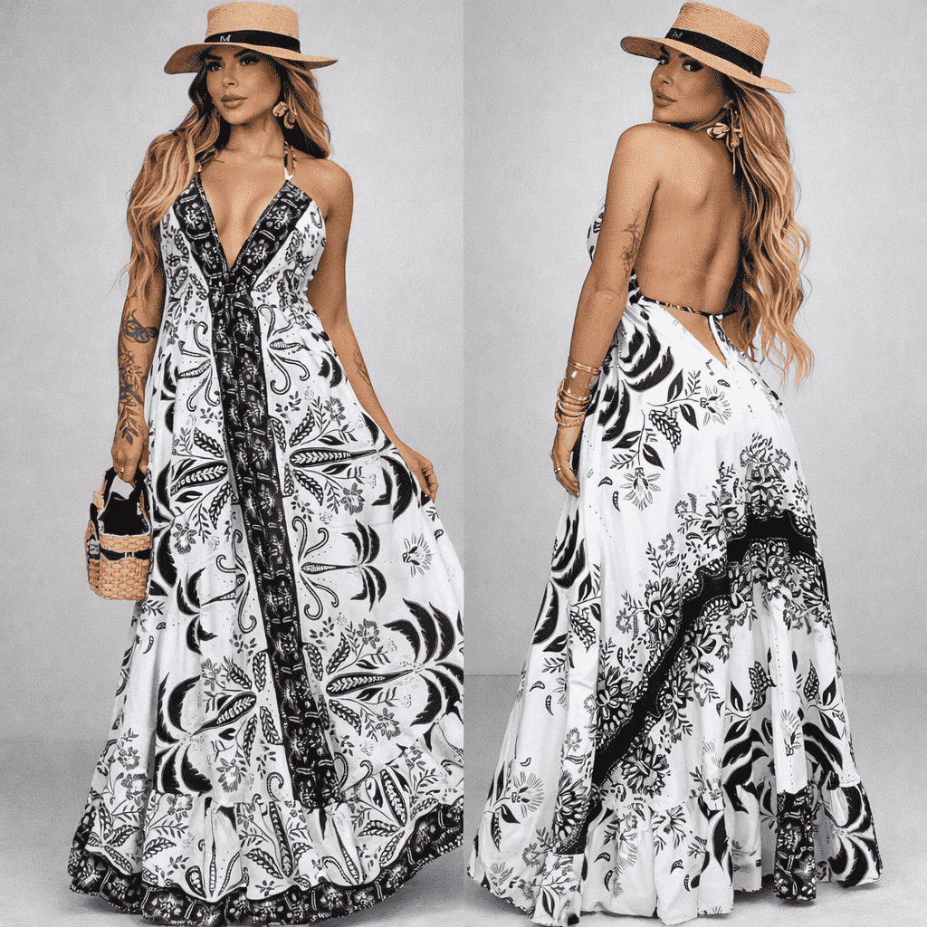 Vestido Longo Feminino Estampado Inspiração Indiano | Alça Fina, Decote V e Costas Nua | Moda Verão