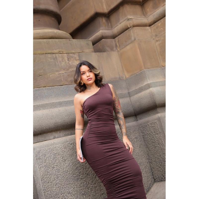 Vestido Longo Feminino Franzido Regata Um ombro só Drapeado Elegante Festa Primavera Verão