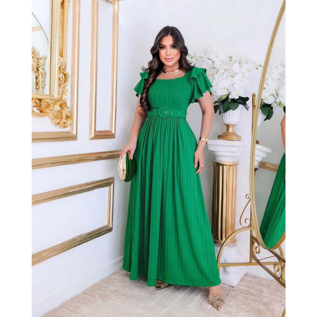 Vestido Longo Feminino Manguinha Godê Moda Evangélica Executiva Social Luxo com Bolso + Cinto 57A