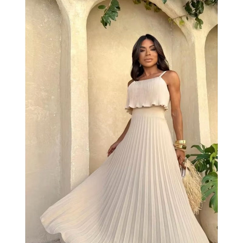 Vestido Longo Feminino Plissado com Alças Finas Camada Na Frente Versátil Lançamento