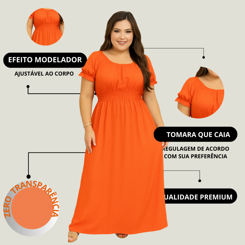 VESTIDO LONGO PLUS SIZE 👗 Este VESTIDO LONGO PLUS SIZE combina elegância e conforto com um toque de versatilidade! Com elastex na cintura, ele se ajusta perfeitamente à sua silhueta, realçando suas curvas de forma sutil e favorecedora. 👚 Na primeira opção de uso, você pode optar pela gola canoa, que adiciona sofisticação e sensualidade ao decote. Destacando os ombros de forma graciosa, esta gola ampla e curvada acrescenta charme ao visual. 👕 Por outro lado, na segunda opção, você pode escolher a gola redonda clássica, perfeita para um estilo mais descontraído e casual. Esta gola simples e atemporal oferece um acabamento limpo ao redor do pescoço, permitindo que outros detalhes do vestido brilhem. 💃 Independentemente da sua escolha, este vestido longo é uma peça indispensável, proporcionando conforto, estilo e versatilidade para diversas ocasiões! ✅Tecido Duna ✅ Formato: Longo ✅ Tipo de Manga: Curta ✅ Com Elastano ✅ TABELA DE MEDIDAS: **Tamanho P 38:** - Busto: 88-90 cm - Cintura: 68-70 cm - Quadril: 94-96 cm **Tamanho M 40:** - Busto: 92-94 cm - Cintura: 72-74 cm - Quadril: 98-100 cm **Tamanho G 42:** - Busto: 96-98 cm - Cintura: 76-78 cm - Quadril: 102-104 cm **Tamanho GG 44:** - Busto: 100-102 cm - Cintura: 80-82 cm - Quadril: 106-108 cm **Tamanho G1 46:** - Busto: 110-114 cm - Cintura: 84-88 cm - Quadril: 110-114 cm **Tamanho G2 48:** - Busto: 114-116 cm - Cintura: 88-90 cm - Quadril: 114-116 cm ✅Várias Cores Disponíveis