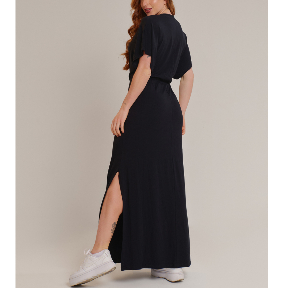 Vestido Longo Feminino Viscolycra com Fenda, Manga Morcego, Decote V e Cintura Ajustável – Casual