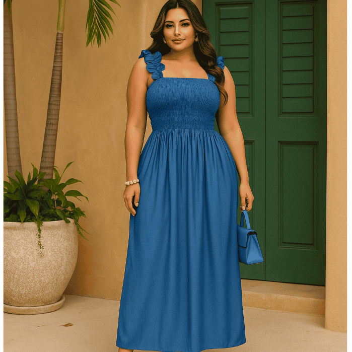 Estilo e Conforto em uma Peça Só! Descubra o look perfeito que une o clássico do jeans chavre com o toque moderno e confortável. Este vestido longo é a escolha ideal para quem quer um visual despojado e elegante ao mesmo tempo. Feito em um tecido leve e maleável, ele se adapta ao seu corpo com perfeição. Detalhes que Fazem a Diferença: Busto com Lastex (Smok): O busto em lastex é o destaque da peça, garantindo um ajuste incrível e confortável que realça a silhueta. Ele se molda ao corpo, proporcionando segurança sem apertar. Alças Delicadas: As alças com babado trazem um charme extra e um toque feminino ao vestido. Elas são confortáveis e dão um acabamento super especial. Caimento Perfeito: A saia longa e fluida tem um caimento impecável, ideal para dar leveza e movimento ao andar. O tecido jeans macio torna o vestido perfeito para qualquer estação. Versatilidade para o Dia a Dia: Este vestido é super versátil e pode ser usado em várias ocasiões: Passeios Casuais: Combine com rasteirinhas ou tênis para um look confortável e estiloso. Eventos Especiais: Use com sandálias de salto ou anabelas e acessórios para um visual mais arrumado. Qualquer Estação: Use-o sozinho nos dias quentes ou adicione uma jaqueta nos dias mais frios TAMANHOS ; UNICO 38/44 Adquira já o seu e tenha uma peça curinga no seu guarda-roupa!