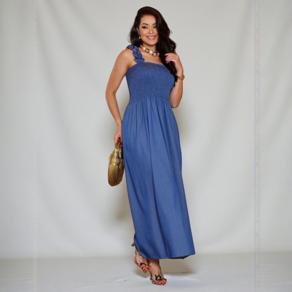 Vestido Longo Jeans Chavre com Lastex e Alças Charmosas