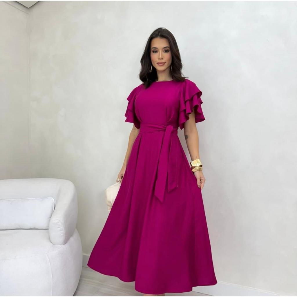 vestido longo manga bufante princesa midi babado com cinto moda elegante evangelica casamento festa