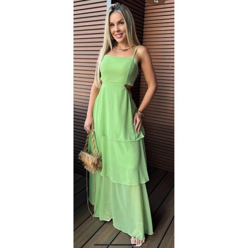 ✅ Detalhes do Produto: * Design: Vestido longo com três babados, oferecendo um caimento perfeito. 🎀 * Detalhes: Nas costas, há uma amarração para ajuste. * Alças: Alças reguláveis para conforto. * Forro e Bojo: O vestido é forrado e possui bojo. * Tamanho: Veste tamanho único, adequado para tamanhos 36, 38, 40 e 42. * Material: Não especificado no produto. * Cuidados: Não há informações sobre cuidados com o produto. Este vestido é perfeito para quem busca um look elegante e confortável.