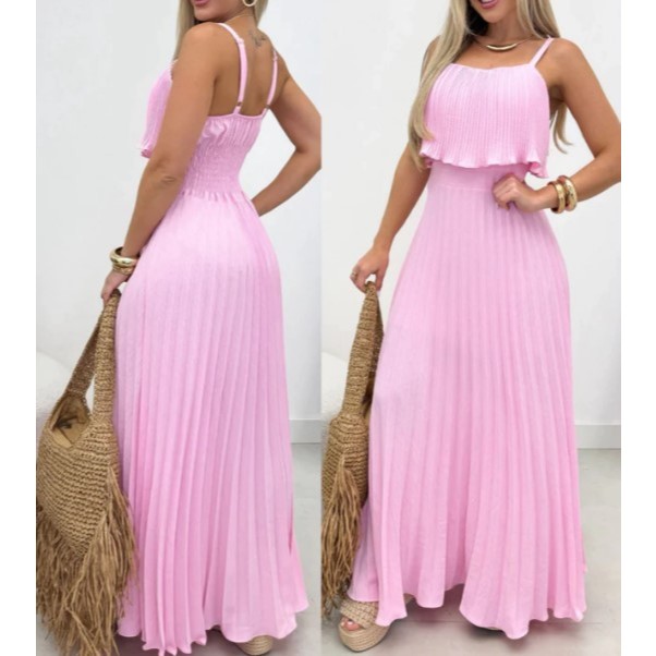 Vestido Longo Plissado Duna Alça Regulável e Elastex nas Costas