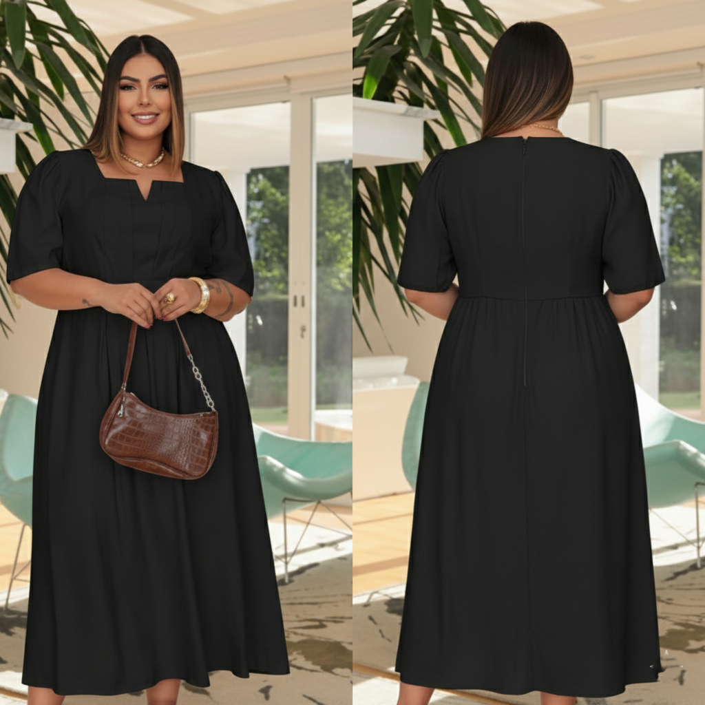 Vestido Longo Plus Size com Gola Quadrada, Detalhe em V e Bolsos Laterais E