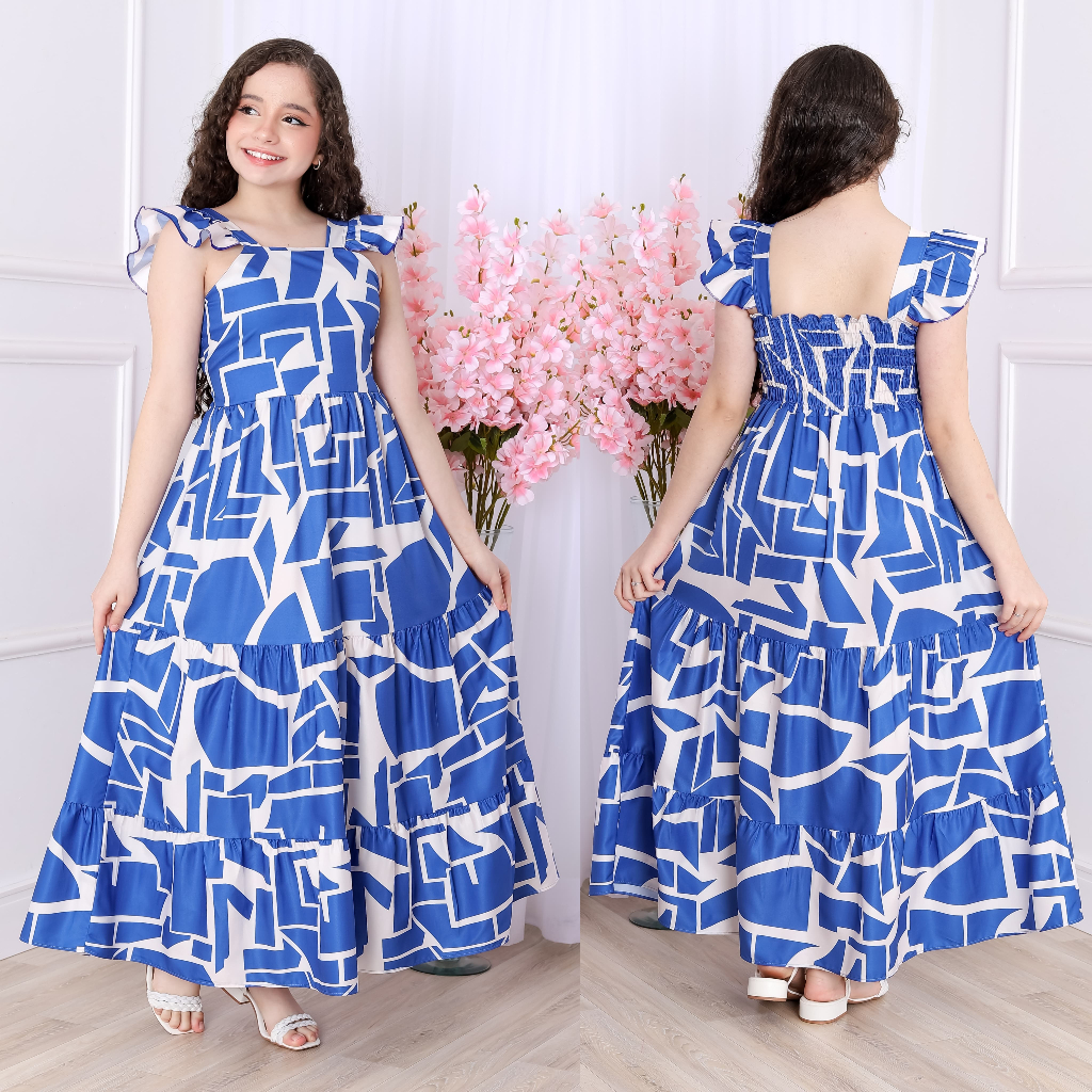 👗 Este vestido infantil é um charme só! Aqui vai uma descrição detalhada: Cor e estanpa: O vestido é predominantemente verde, adornado com um elegante padrão geométrico branco que traz um toque moderno e delicado ao mesmo tempo. Modelagem: Parte superior: Sem mangas, com detalhes de babados nos ombros e um decote quadrado que confere um ar gracioso. Parte traseira: Possui elástico franzido que proporciona conforto e um caimento ajustável ao corpo da criança. Saia: Longa e dividida em três camadas de babados que criam volume e movimento, perfeita para ocasiões especiais ou um dia de passeio encantador tecido:CREPINHO