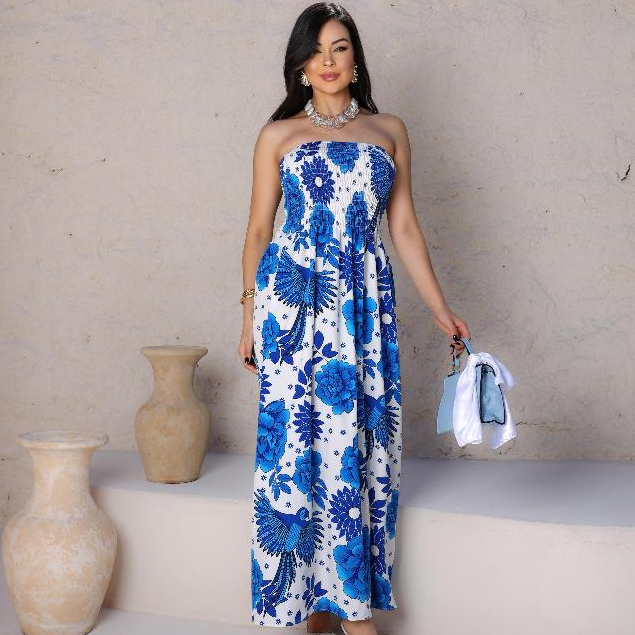 Descrição: Vestido Longo Tomara que Caia Estampado Realce sua beleza com este vestido longo tomara que caia, uma peça cheia de elegância e frescor. A estampa floral em tons de azul e branco é clássica e sofisticada, perfeita para quem busca um visual marcante. O modelo possui um busto em lastex (smok) que garante um ajuste perfeito ao corpo, modelando a silhueta com conforto e segurança. A saia, com caimento fluido, proporciona movimento e leveza a cada passo. Características: Estilo: Vestido longo tomara que caia. Estampa: Floral em azul e branco, com detalhes delicados de flores. Ajuste: Busto com lastex para maior conforto e adaptação ao corpo. Tecido: Leve e com ótimo caimento. Este vestido é ideal para diversas ocasiões, desde um almoço ao ar livre até um evento especial à noite. Combine com sandálias ou saltos para um look completo e impecável. Garanta já o seu e arrase com a sofisticação da estampa floral