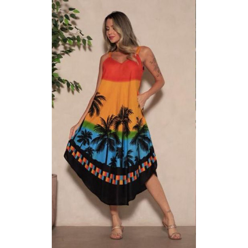 Vestido trapézio que combina a riqueza da técnica do butique com cores suaves que evocam a beleza primaveril. Observação; por se tratar de um produto artesanal e alguns com tingimento artesanal, pode haver pouca diferença na tonalidade da cor. Qualquer dúvida estamos sempre disponíveis, não hesite em nos perguntar. Descrição do Produto: Composição: 100% Viscose Tamanho único (veste do 36 ao 50) BUSTO: 62 CM QUADRIL: 154 CM COMPRIMENTO: 98 CM