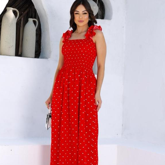 Vestido Longo Vermelho Estampado de Corações - Alças com Babado e Lastex