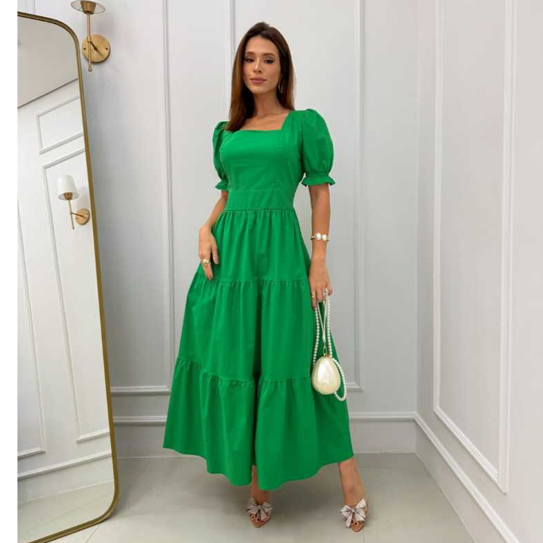 Vestido Longuete Manga Princesa Tecido Tricoline Liço 100% Algodão