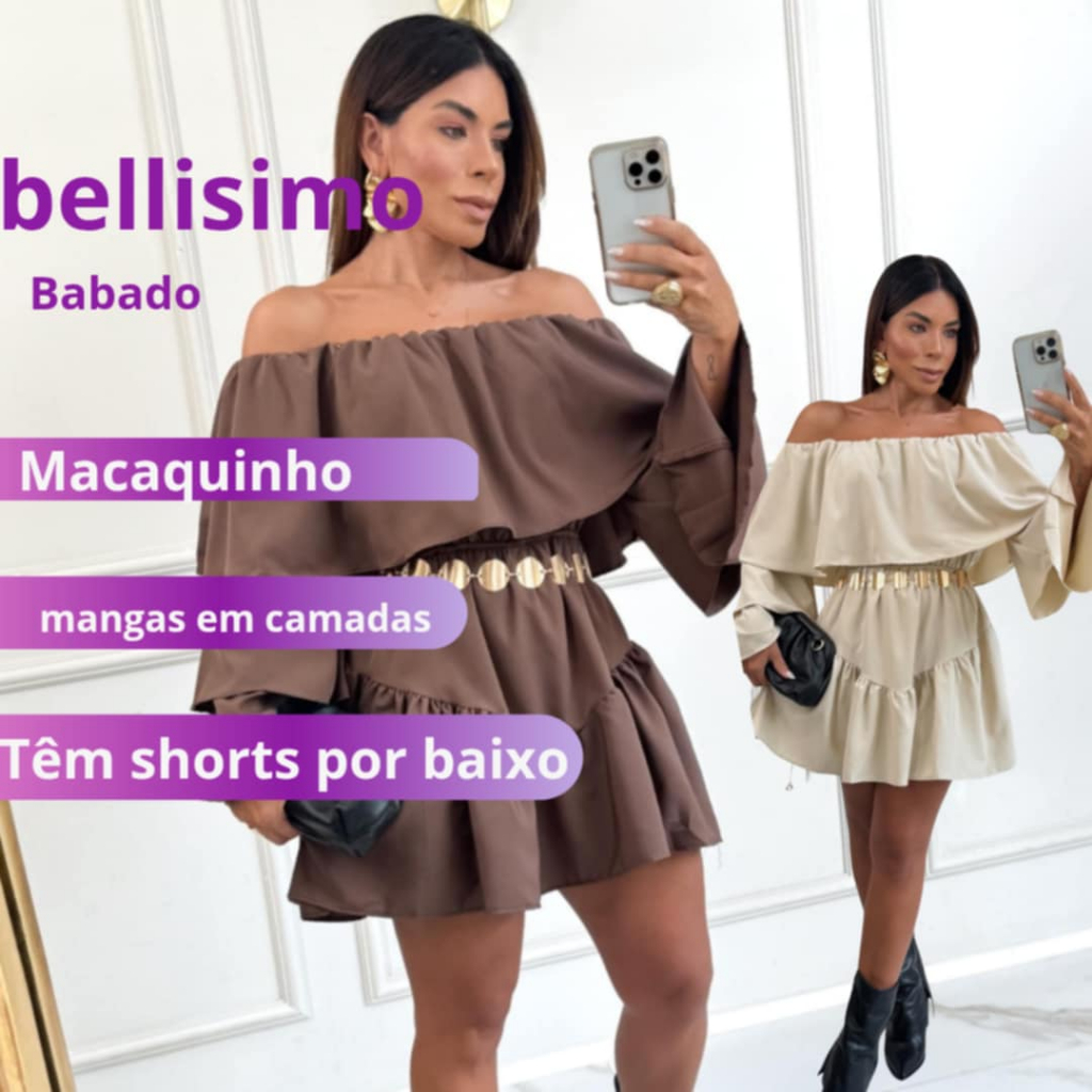 | Vestido Macaquinho> Babado Curto Chiffon Manga em Camadas este produto | R$ 77,00 | 30% | 4.9/5 | 243 |