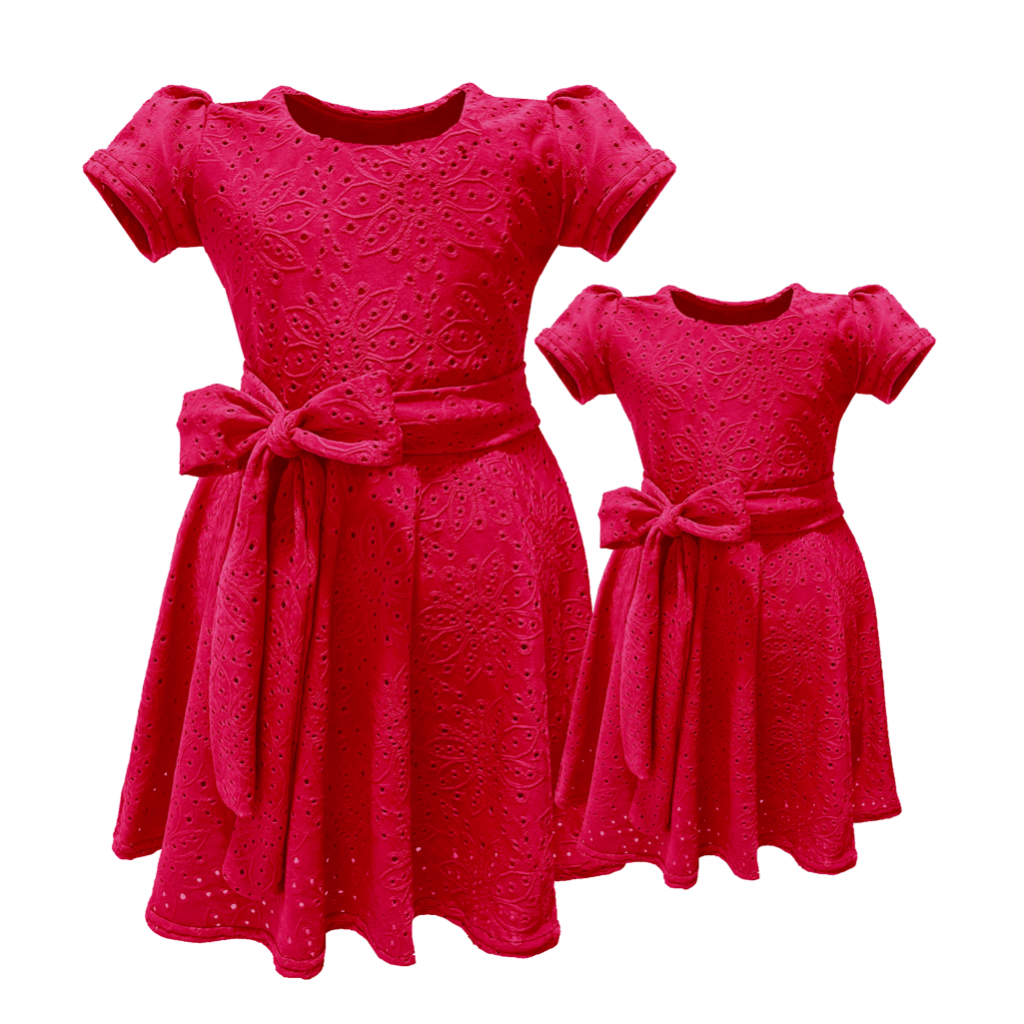 Vestido Mãe E Filha Malha Laise Manga Curta Faixa Amarrar
