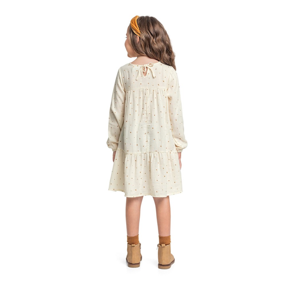 Vestido manga longa infantil para menina, confeccionado em tecido texturizado de algodão, oferecendo conforto e um toque sofisticado. Os recortes franzidos garantem um caimento gracioso, enquanto o elástico na barra das mangas proporciona charme e praticidade. A amarração na gola que forma um laço nas costas é um detalhe encantador, e a estampa delicada completa o visual com elegância.Tecido: Tecido texturizado de algodãoComposição: 100% algodãoModelagem: JustaComprimento Mangas: LongaComprimento: Curto Forro: NãoDecote/Gola: RedondoFechamento: Amarração
