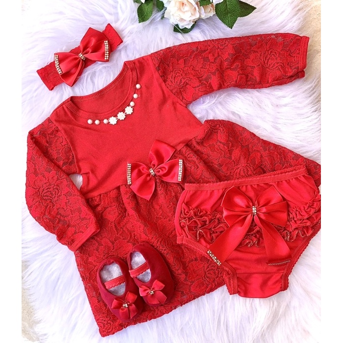 vestido manga longa para bebê menina, calcinha tapa fralda laço e calcinha festas.