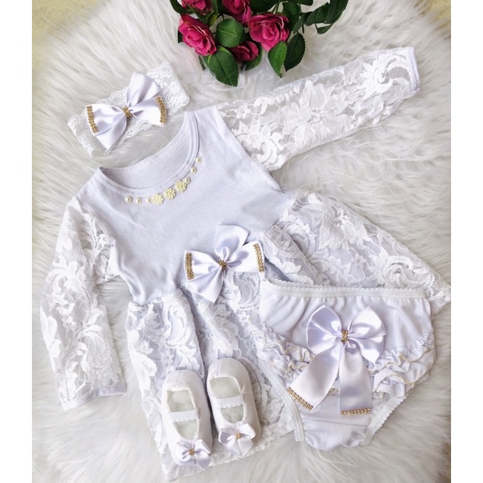 Kit Luxo Com Vestido Manga Longa + Calcinha Bunda Rica + Sapatinho + Faixa de Cabeça Conjunto 4 Peças: -01 Vestido com Renda Manga Longa; -01 Calcinha Bunda Rica; -01 Sapatinho; -01 Faixa para Cabeça de Renda com Laço. Medida Vestido : Altura 40 cm Largura 25 cm Tamanho veste 0 a 6 meses. Dependendo do tamanho do bebê. Sapatinho medida 10cm comprimento. Recomendamos lavagem à mão e não alvejar. Certifique se seus dados estão corretos para o envio. * As medidas podem variar 02cm para mais ou para menos. ** Conferir as medidas antes de finalizar a compra.