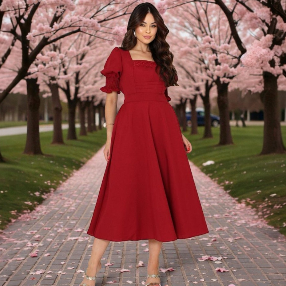 Vestido Midi Bordô Romântico Blogueira Moda Evangélica Decote Quadrado Manga Bufante