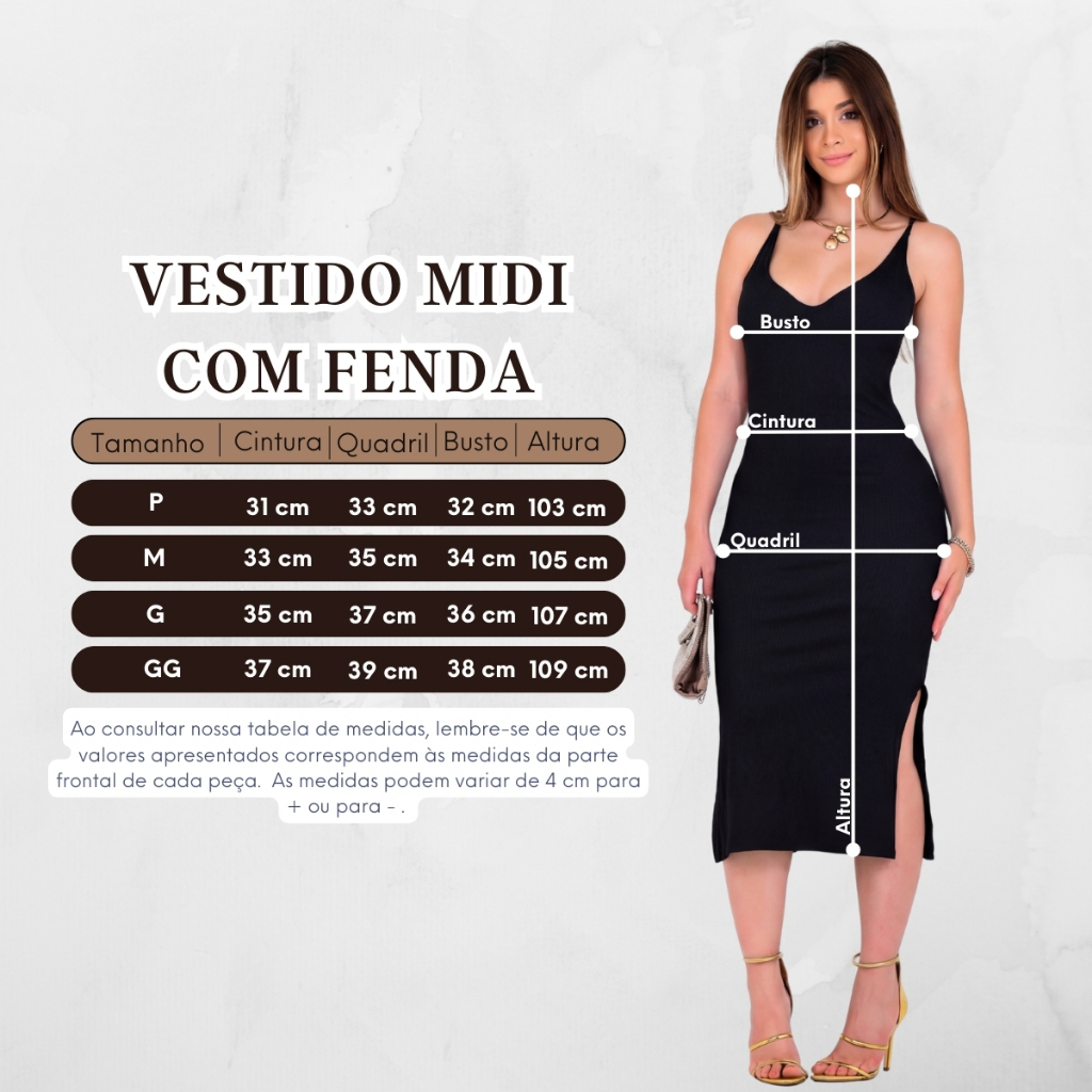 👗 Vestido Midi Canelado Elegância, conforto e sensualidade na medida certa. Nosso vestido canelado foi desenvolvido para valorizar as curvas com sofisticação e caimento impecável. Com decote em V que alonga a silhueta, alças finas delicadas e fendas laterais que garantem charme e liberdade de movimento, é a peça ideal para quem busca um visual moderno e feminino, perfeito tanto para ocasiões casuais quanto para eventos especiais. Confeccionado em tecido canelado de alta qualidade, oferece conforto, elasticidade e excelente ajuste ao corpo. Detalhes do produto: Vestido canelado feminino Decote em V Alças finas Fendas laterais Modelagem que valoriza o corpo Toque macio e confortável Composição do tecido: 96% Algodão 4% Poliéster ••••••••••••••••TABELA DE MEDIDAS••••••••••••••••• P -VESTE 36-38 // M -VESTE 40-42 // G VESTE 44 P: 36/38 - BUSTO 90/96cm // CINTURA: 60-70cm // QUADRIL: 94-102cm M: 40/42 - BUSTO 98-106cm // CINTURA: 72-80cm // QUADRIL: 104-108cm G: 44 - BUSTO 108-110cm // CINTURA: 82-88cm // QUADRIL: 110-112cm Informações importantes: Produto à pronta entrega Envio em até 24 horas após a confirmação do pagamento Excelente acabamento e qualidade Uma peça versátil, elegante e indispensável no guarda-roupa feminino.