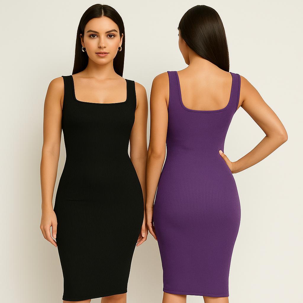 Vestido Midi Canelado Justo Feminino com Alças Largas e Decote Quadrado – Confortável e Estiloso