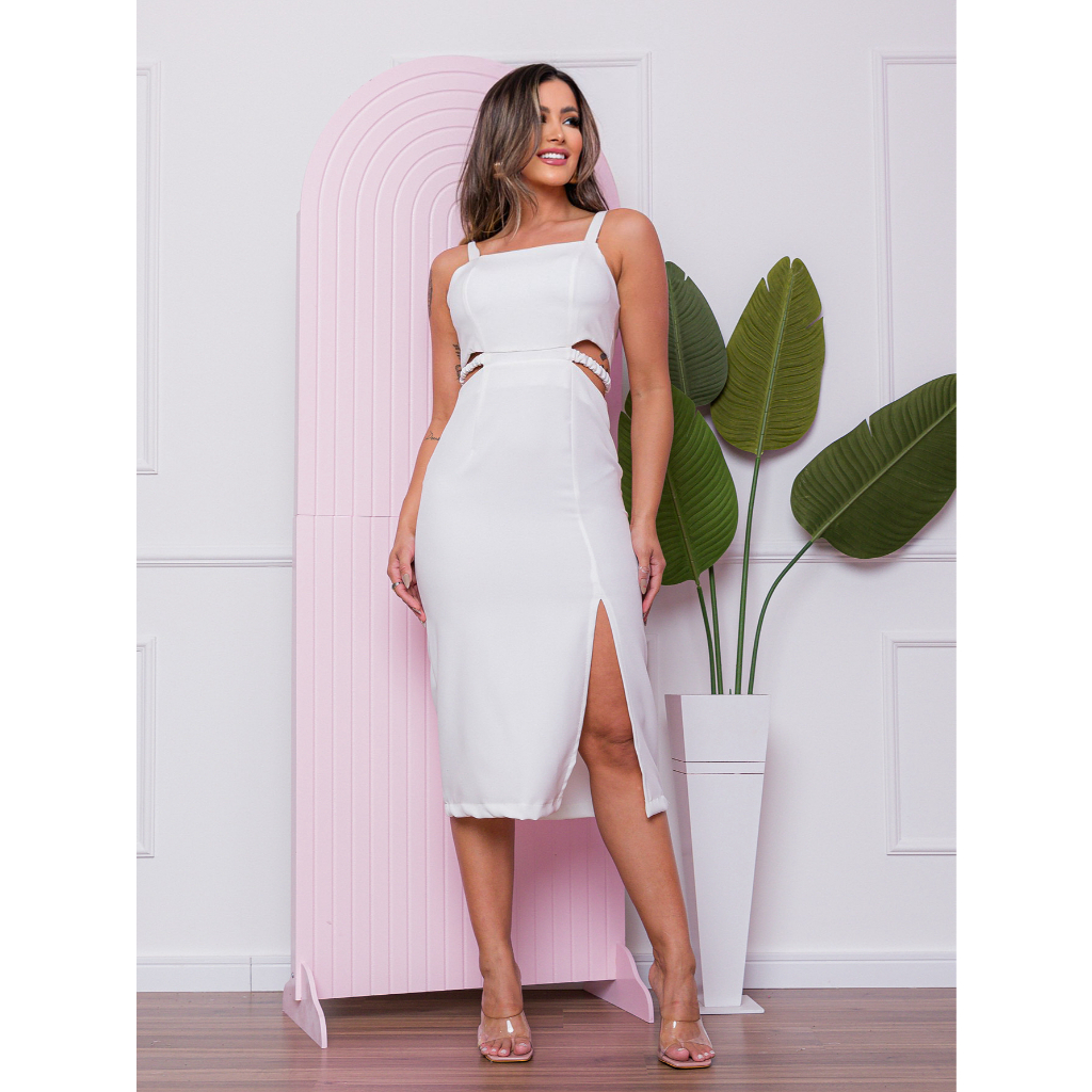 Design "Cut-Out" Sofisticado:O destaque deste vestido é o recorte estratégico na cintura (cut-out), que cria um visual moderno, ousado e muito feminino. Detalhe de Franzido Elástico:Possui detalhes franzidos com elástico nas laterais, garantindo um ajuste perfeito ao corpo e adicionando textura ao design. Fenda Lateral Irresistível:A saia apresenta uma fenda elegante que proporciona liberdade de movimento e um toque extra de sensualidade refinada. Silhueta que Valoriza o Corpo: Com alças largas e busto estruturado, o modelo valoriza o colo e define a cintura, alongando visualmente a silhueta. Tecido Versátil e Cores Tendência:Confeccionado em tecido leve e de alta qualidade, está disponível em cores modernas que combinam com festas, jantares ou eventos casuais.