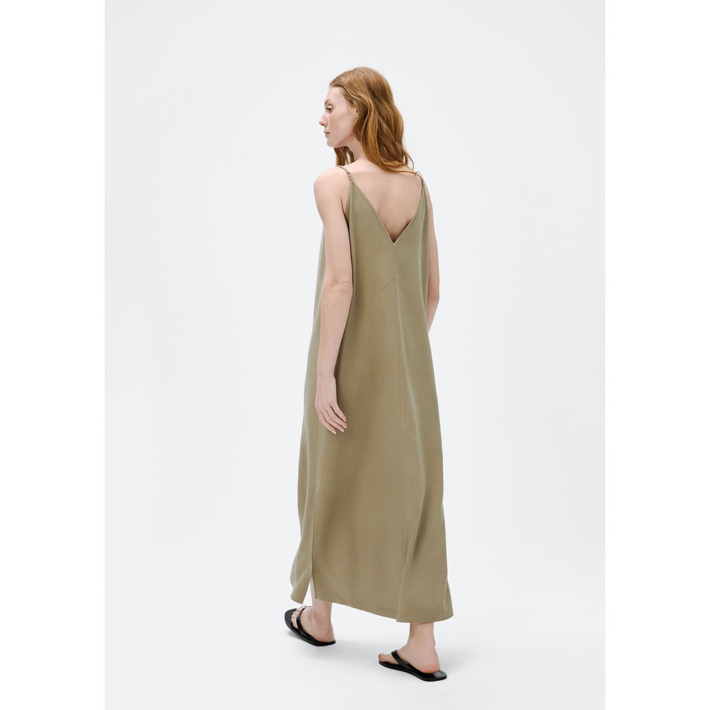 Vestido midi com alças finas ajustáveis em tecido peachtouch, que proporciona toque macio. Possui decote V frontal e posterior, fenda lateral e modelagem regular solta ao corpo para um visual leve e elegante. Detalhes da peça:Tecido peachtouchModelagem retaComprimento midiDecote VAlças finasFenda lateral
