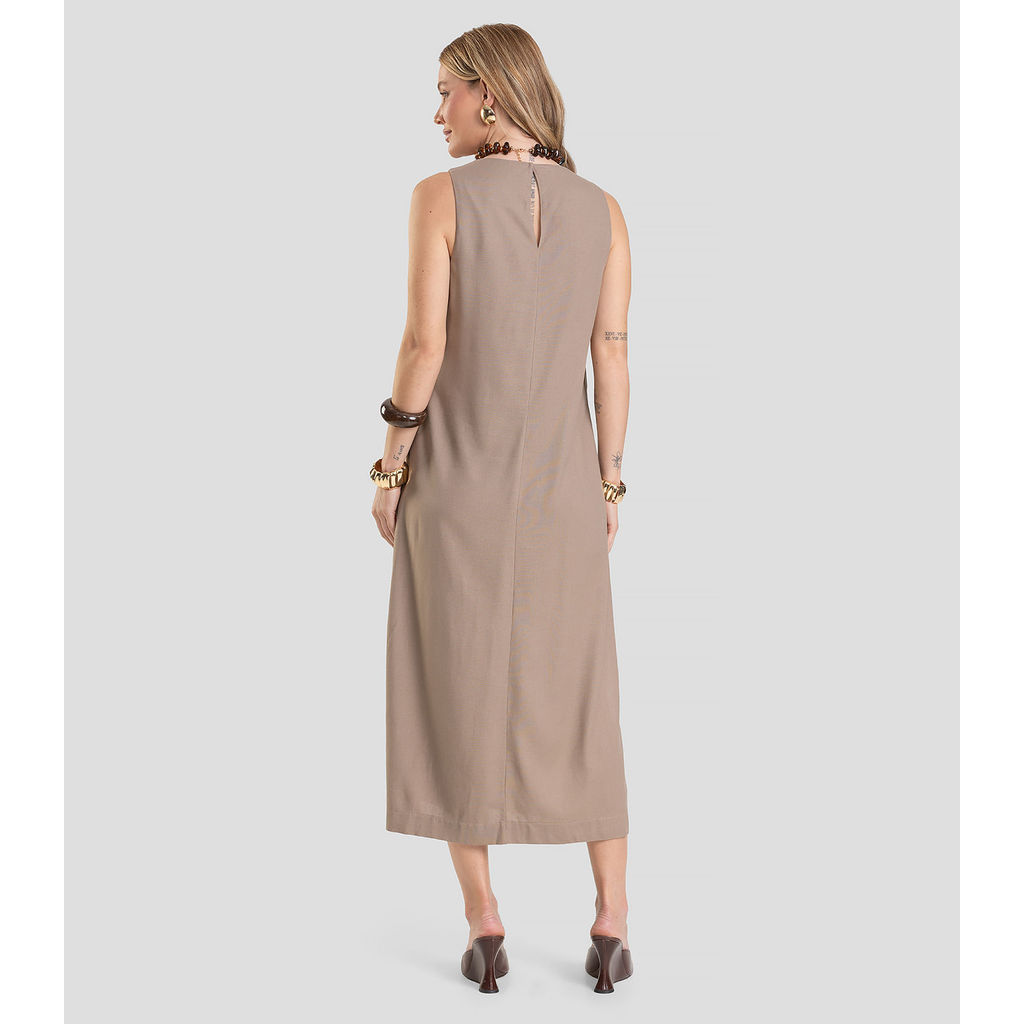 Vestido Midi Feminino Dianna, desenvolvido em Tecido Linho, que combina leveza, elegância e caimento natural. Possui decote e cavas com acabamento em revel, pence no busto que valoriza a silhueta e bolsos laterais funcionais, que trazem praticidade. As fendas laterais proporcionam liberdade de movimento e toque moderno. Nas costas, detalhe em gota com fechamento por botão, garantindo um visual delicado e sofisticado.
