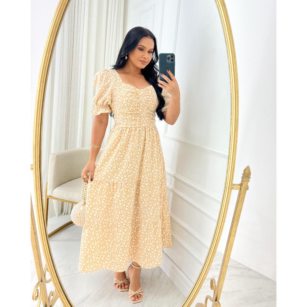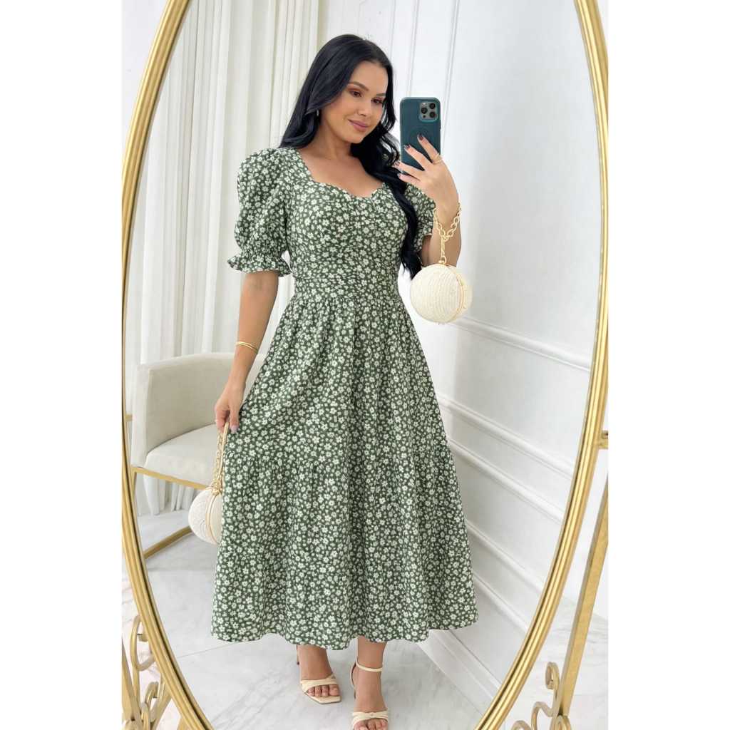 vestido midi feminino estampado com mangas bufantes elástico nas costas
