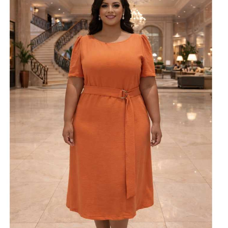 Vestido Midi Feminino Plus Size Moda Evangelica Tecido Elastano Forrado Manga Princesa com Cinto
