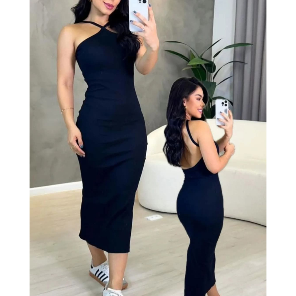 Vestido midi Giorgina canelado ribana de alça cruzada com fenda costa nua