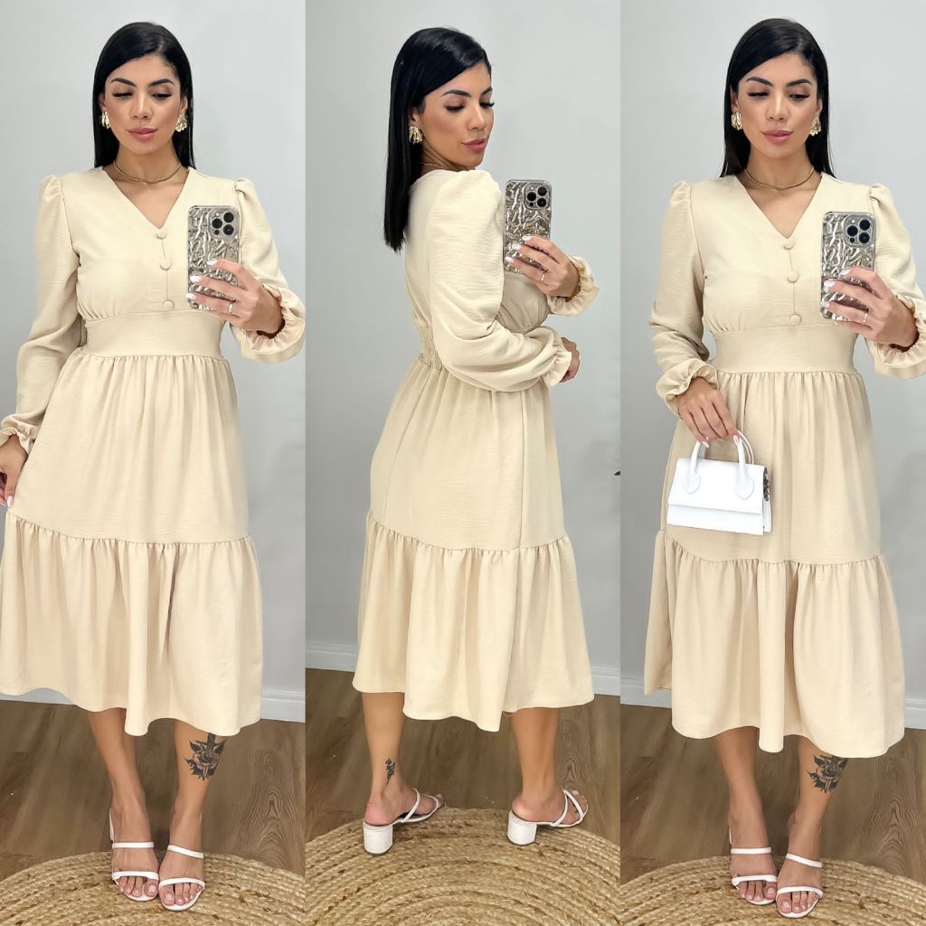 Vestido midi de manga longa, em tecido 100% DUNA, contem Elastex nas costas Tamanho: Único = SERVE PRA --- > P/M/G = 38 / 40 / 42 / 44 MEDIDAS DO VESTIDO Busto 88 a 106 cm Cintura 66 a 96 cm Quadril 94 a 128 cm Comprimento 105 cm --------------------------------------------------------------------------------------------------------------------- Tamanho: Único Plus Size = SERVE PRA --- > GG/G1/G2 = 44 / 46 / 48 / 50 • Não possui bojo • Todos os vestidos possuem forro • Botões somente de enfeite Como é o tecido Duna ? O Tecido Crepe Airflow tambem conhecido como Crepe Duna, é moderno e tecnológico, muito procurado pela sua versatilidade e praticidade, pois é um tecido que dispensa passar. È um tecido bastante fresco e leve
