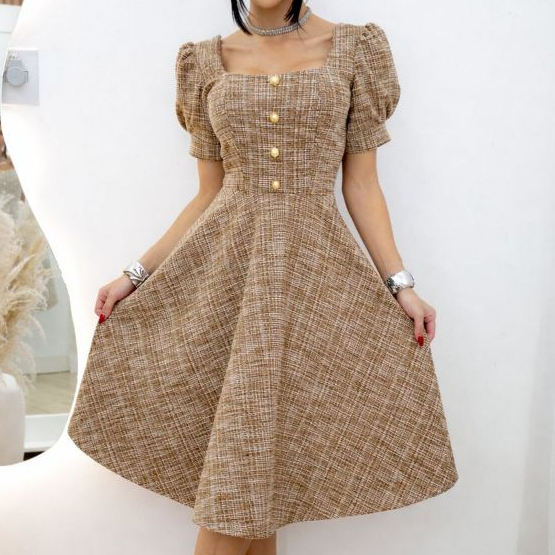 Vestido Mídi Manga Princesa Tweed Botões Dourados Elegante Casual Feminino Vestido Para Formaturas**