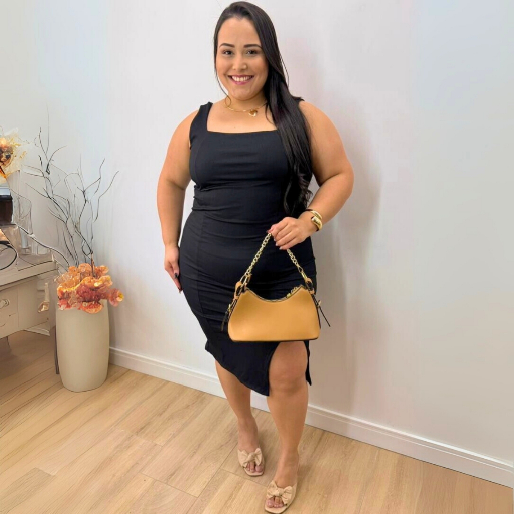Vestido Midi Plus Size Regata Gola Quadrada Com Fenda Frontal Conforto Elegancia No Verao