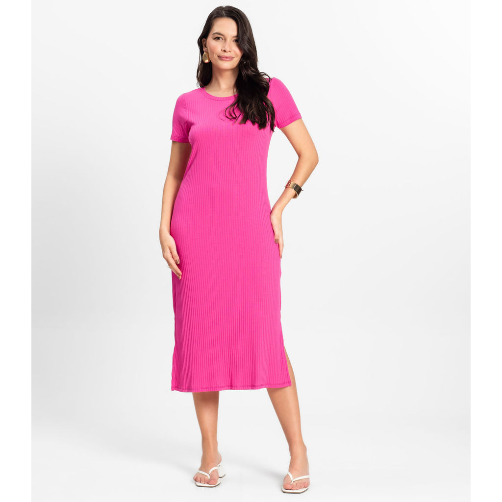 Vestido Midi Ribana Canelada Básico Rovitex Rosa
