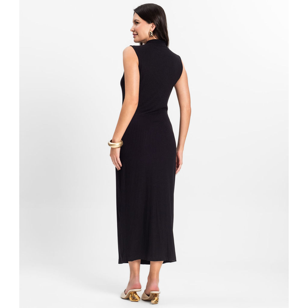 Vestido Midi confeccionado em Ribana Canelada, com modelagem reta e confortável. Possui gola chaminé com acabamento limpo, cavas reforçadas com friso e etiqueta interna discreta. A peça tem barra com costura dupla para maior durabilidade. Ideal para um visual moderno e descomplicado, pode ser usado em diferentes ocasiões com muito estilo e praticidade.