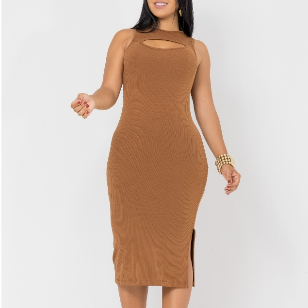 Vestido Midi Tubinho Com Fenda Canelado Premium LANÇAMENTO