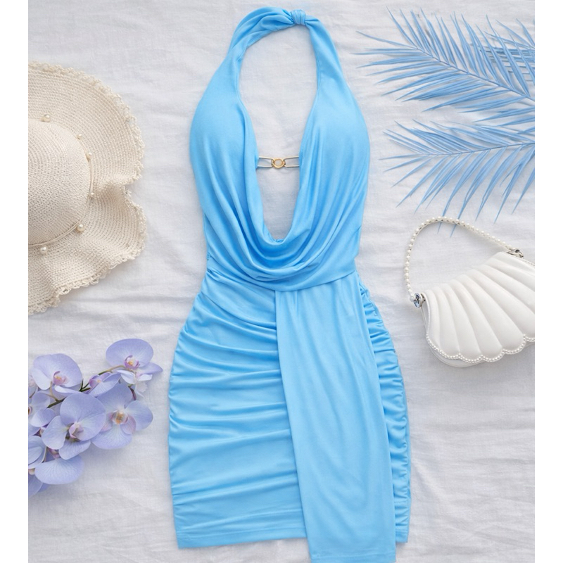 Vestido NINA 2 Peças com Decote Drapeado e Detalhe Corrente Colado Curto Tubinho e Fashion