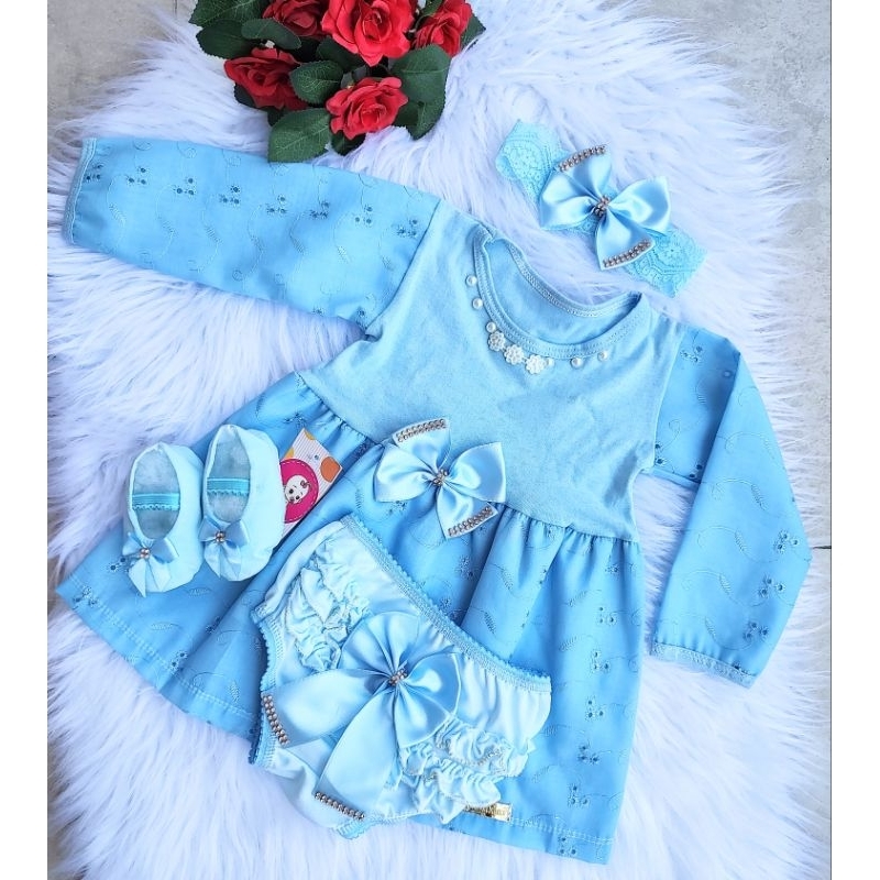 vestido para bebê com laço sapatinho e calcinha tapa fralda 4 peças.