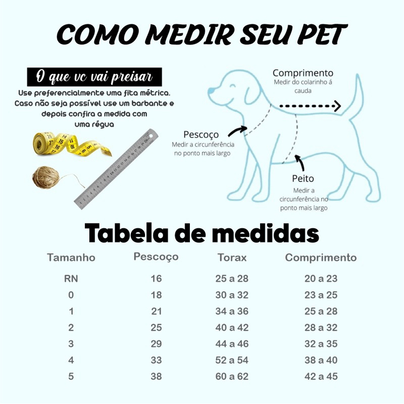 Vestido Pet 100% poliéster 4% elastano Conforto e charme para o seu pet! Feito em tecido leve e elegante, com botões de pressão que facilitam na hora de vestir. Antes da compra, meça seu pet — as medidas podem variar entre vendedores. Tabela de Medidas: • RN: Pescoço 16 | Tórax 25 | Comp. 18 • 0: Pescoço 18 | Tórax 30 | Comp. 23 • 1: Pescoço 21 | Tórax 34 | Comp. 25 • 2: Pescoço 26 | Tórax 40 | Comp. 28 • 3: Pescoço 29 | Tórax 45 | Comp. 34 • 4: Pescoço 33 | Tórax 52 | Comp. 42