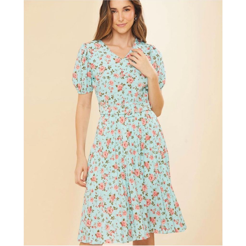 Vestido Plissado Estampado Flor Manga Curta Moda Feminina -046