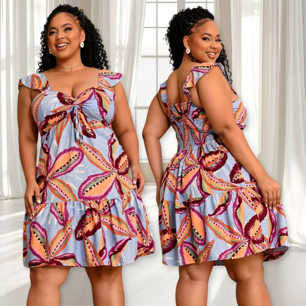 Vestido Plus Size Curto com Manga Babado e Lastex nas Costas Caimento Perfeito para o Dia a Dia