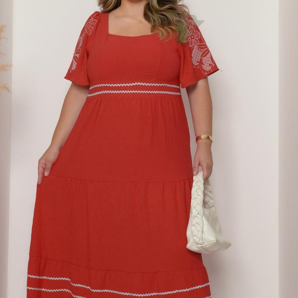 Modelo: Vestido longo evasê, ideal para alongar a silhueta e proporcionar conforto. ---- ESGOTOU G2 ------ Cor: Azul claro, suave e elegante. Decote: Quadrado, valorizando o colo com sofisticação. Mangas: Curtas e soltas, com detalhe estampado floral branco, trazendo um toque romântico e delicado. Cintura: Marcada por faixa com aplicação de detalhe em zigue-zague branco, que afina visualmente a silhueta. Saia: Longa, fluida e com leve efeito rodado, composta por recortes horizontais e dois filetes de zigue-zague branco próximos à barra para harmonizar o design. Comprimento: Longo, perfeito para ocasiões casuais e semi-formais. Tecido: Malha leve e confortável, com ótimo caimento e movimento. Estilo: Versátil, podendo ser usado com sandálias, rasteirinhas ou salto bloco. Tamanhos disponíveis: Plus Size G1 e G2, garantindo ajuste perfeito para diferentes corpos.