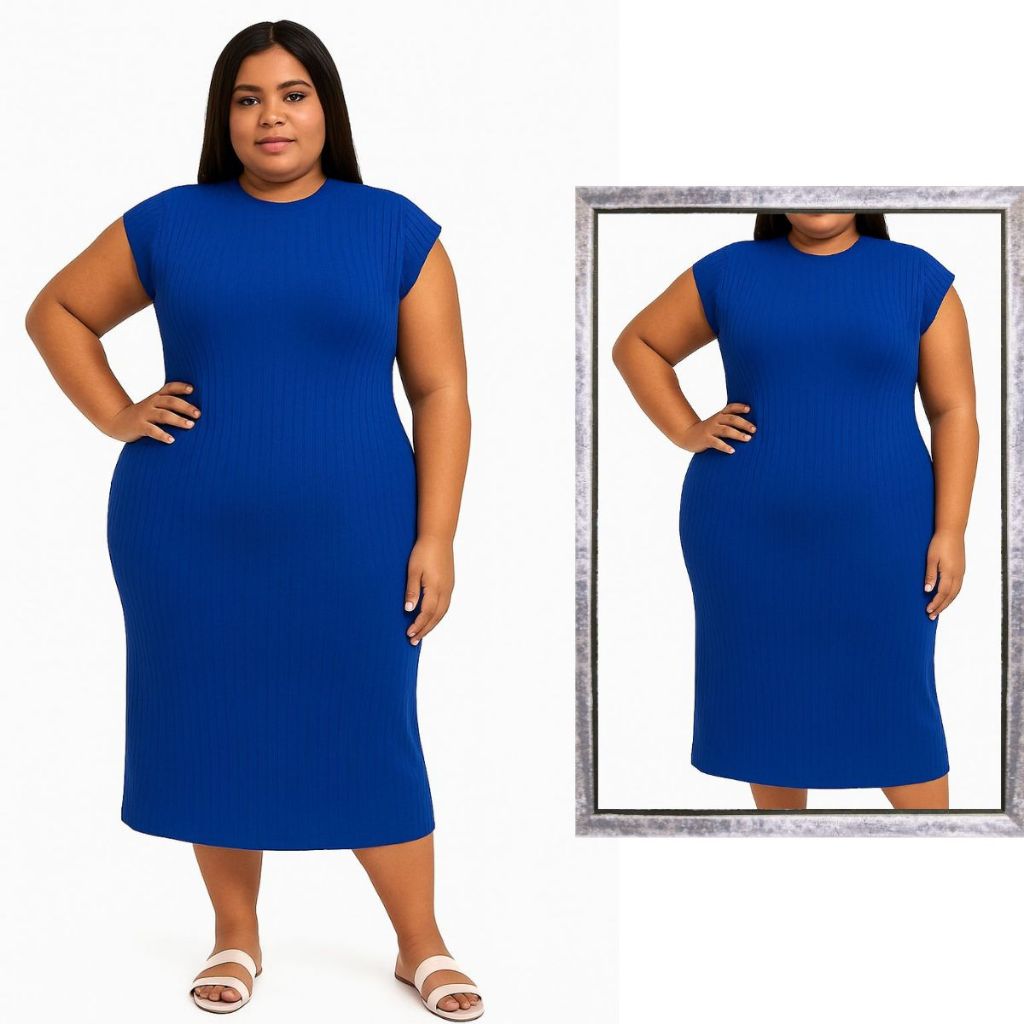 Vestido Plus Size Feminino Midi Manga Curta Básico Curve Canelado