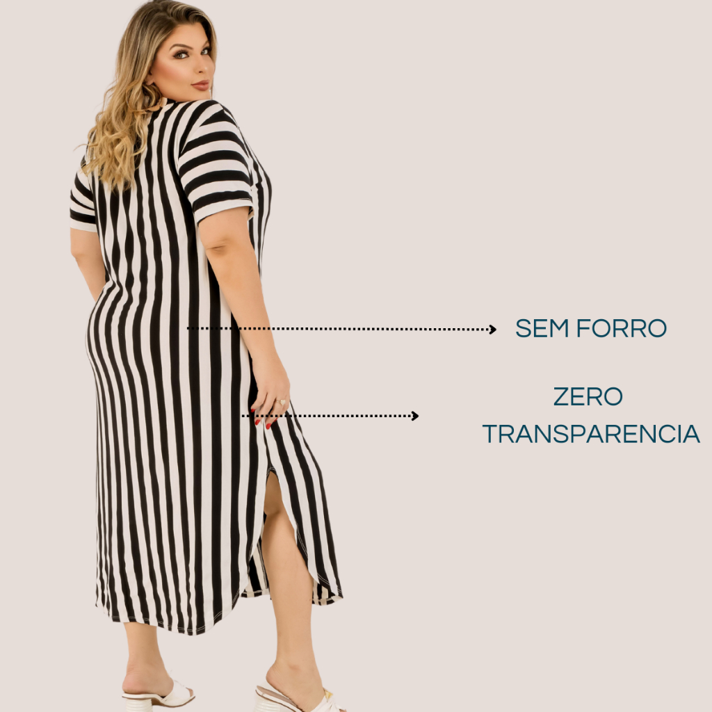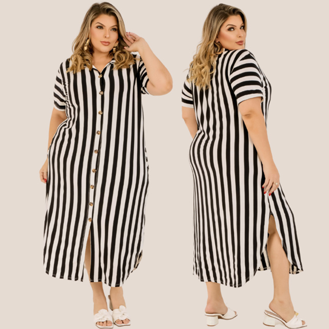 Vestido Plus Size G1 Ao G3 Chemise Soltinho Manga Curta Verão Elegante Listrado Midi