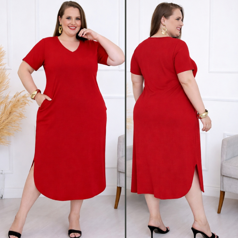 Vestido Plus Size Midi Longo com Bolsos Funcionais e Fendas Laterais - Veste do 42 ao 56