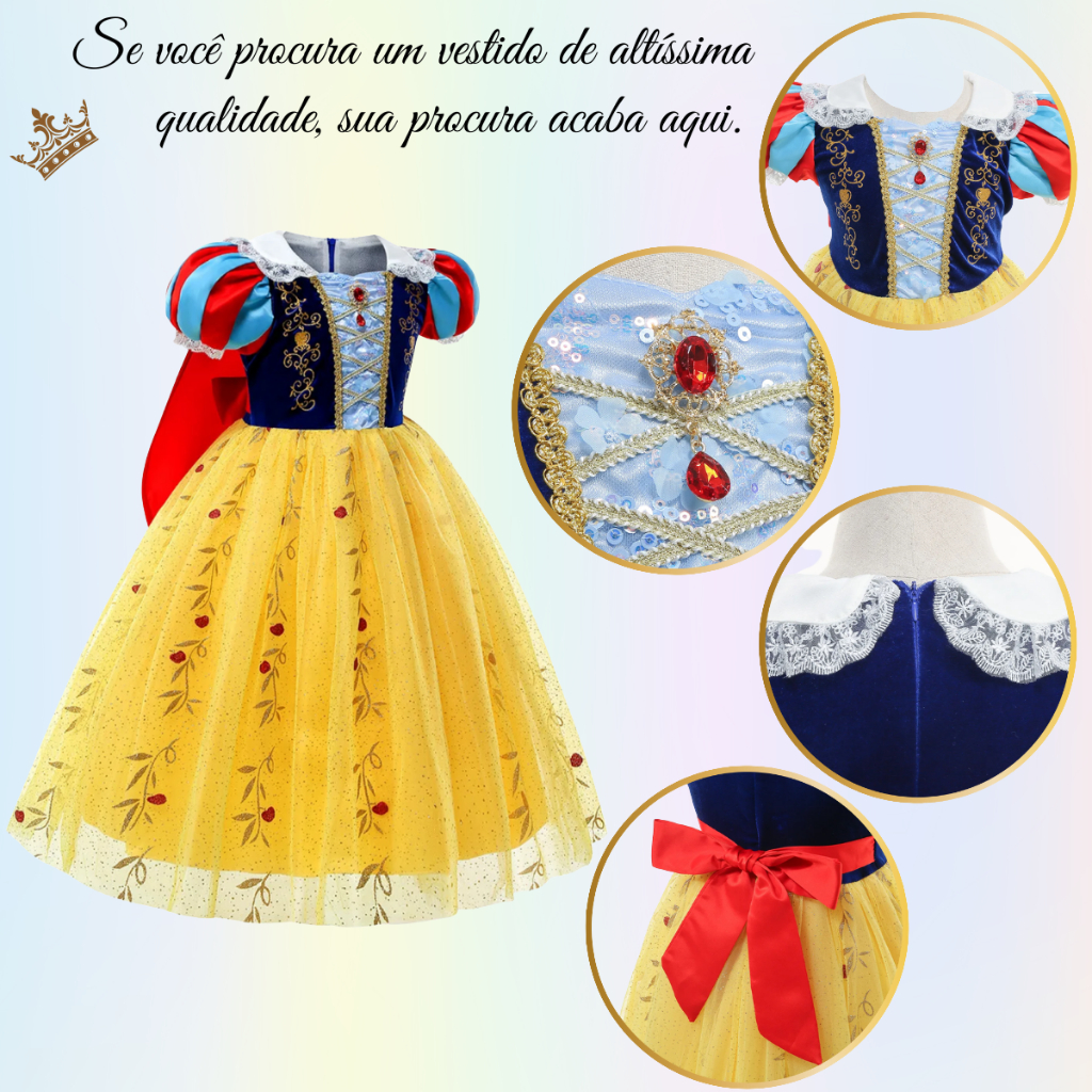 Vestido Princesa Branca de Neve Alta Qualidade Premium Com Capa Luxuoso Menina Festa Fantasia