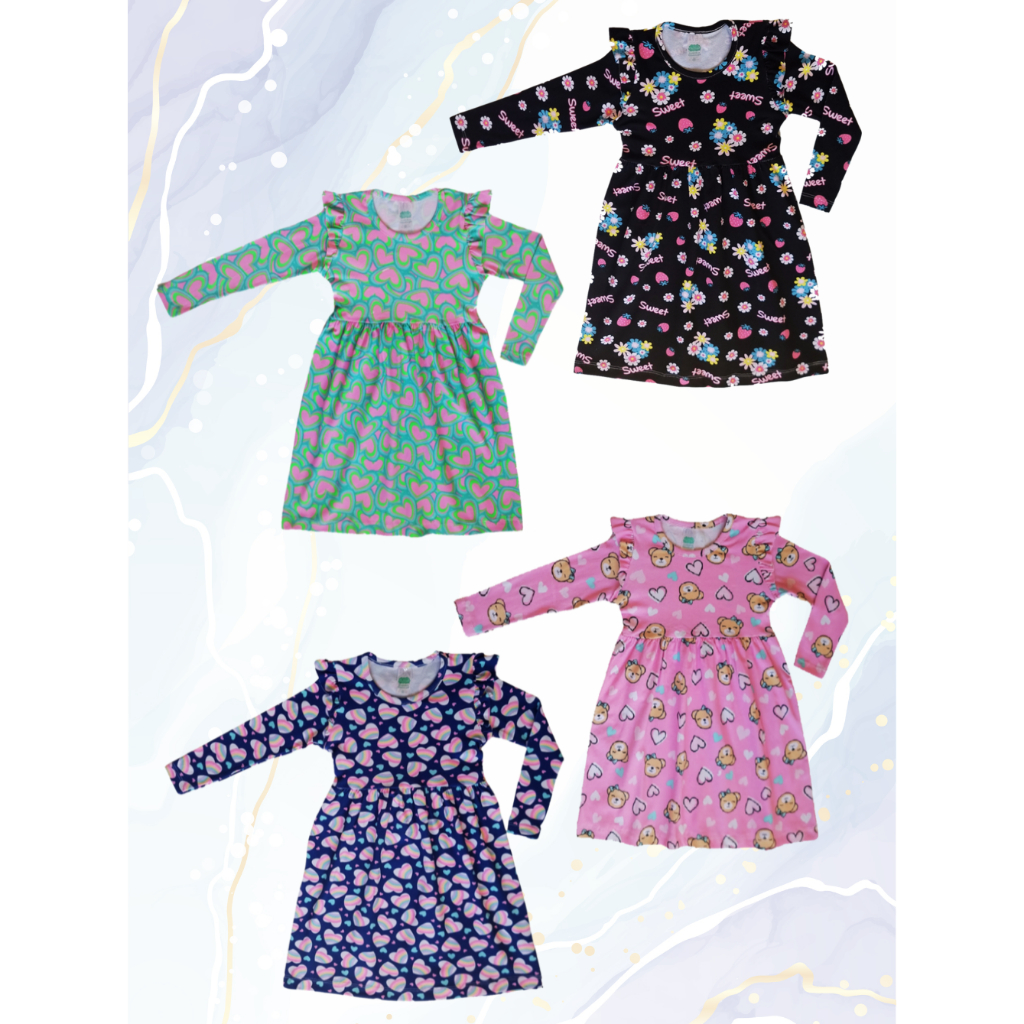Vestido Princesa Meia Estação infantil 1 ao 14 Manga Longa em Cotom Estampado