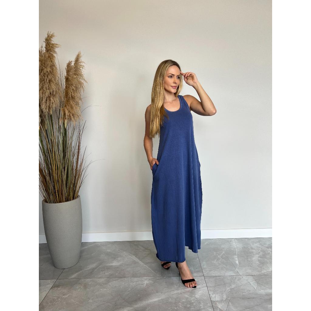 Vestido Regata Longo Estonado com Bolsos 100% Algodão Malha Confortável Visual Vintage Feminino live
