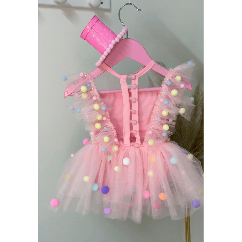 Vestido + romper 2 em 1 no tema circo rosa Saia removível com zíper Romper com elástico na cintura e fechamento de botão Disponível nos tamanho de 1 a 3 anos